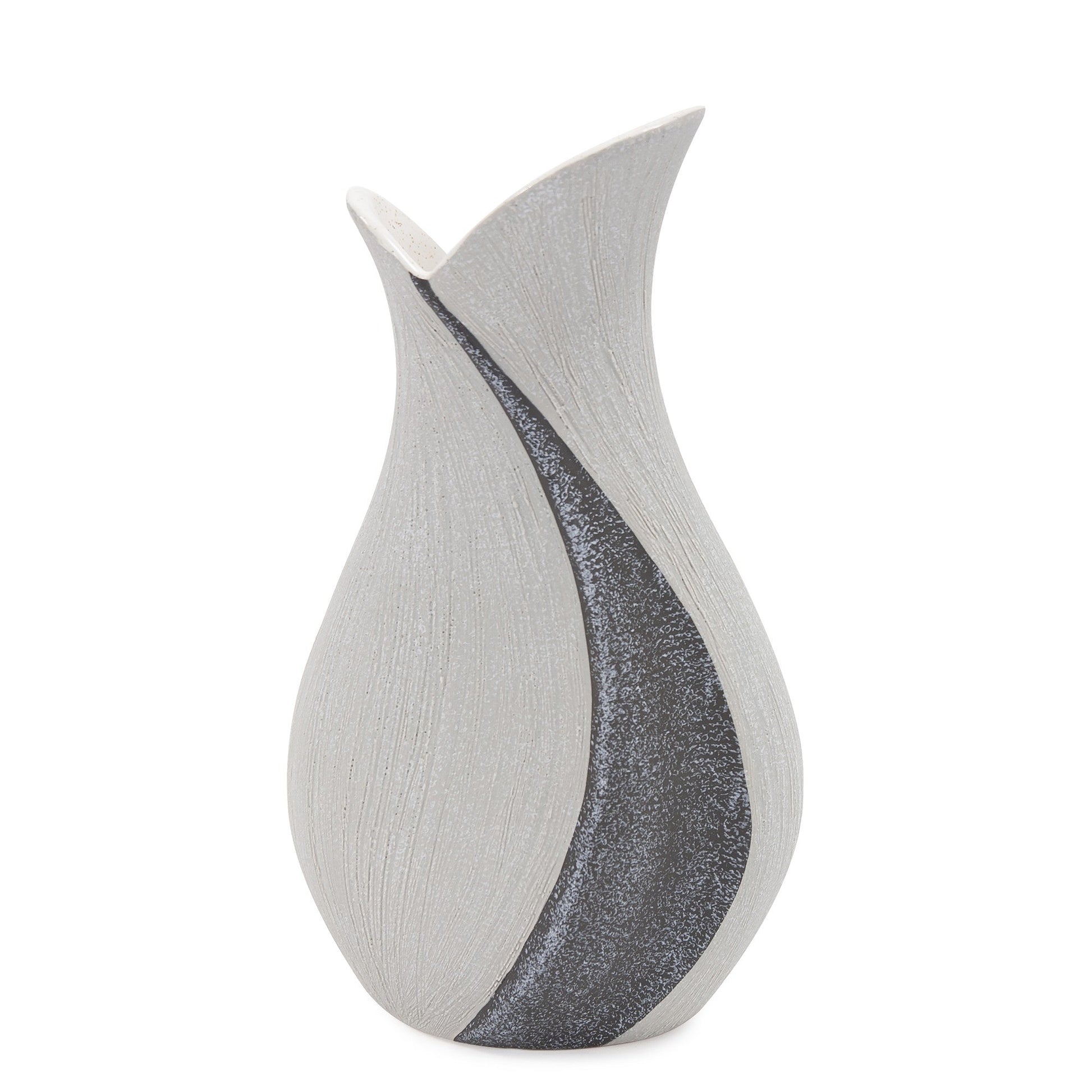 Elevate your decor with the 10-inch gray and off white tulip ceramic table vase with sequins, a stunning piece that adds elegance to any space. The tulip shape of this ceramic table vase brings a touch of nature indoors, while the gray and off white hues complement a variety of color schemes. Adorned with delicate sequins, this vase boasts additional embellishments that catch the light and create a glamorous aesthetic. Perfect for displaying your favorite blooms or as a standalone decorative accent, this vase exudes sophistication and charm. Enhance your home with the unique beauty of this exquisite piece. 10-inch H x 5-inch W x 4-inch D